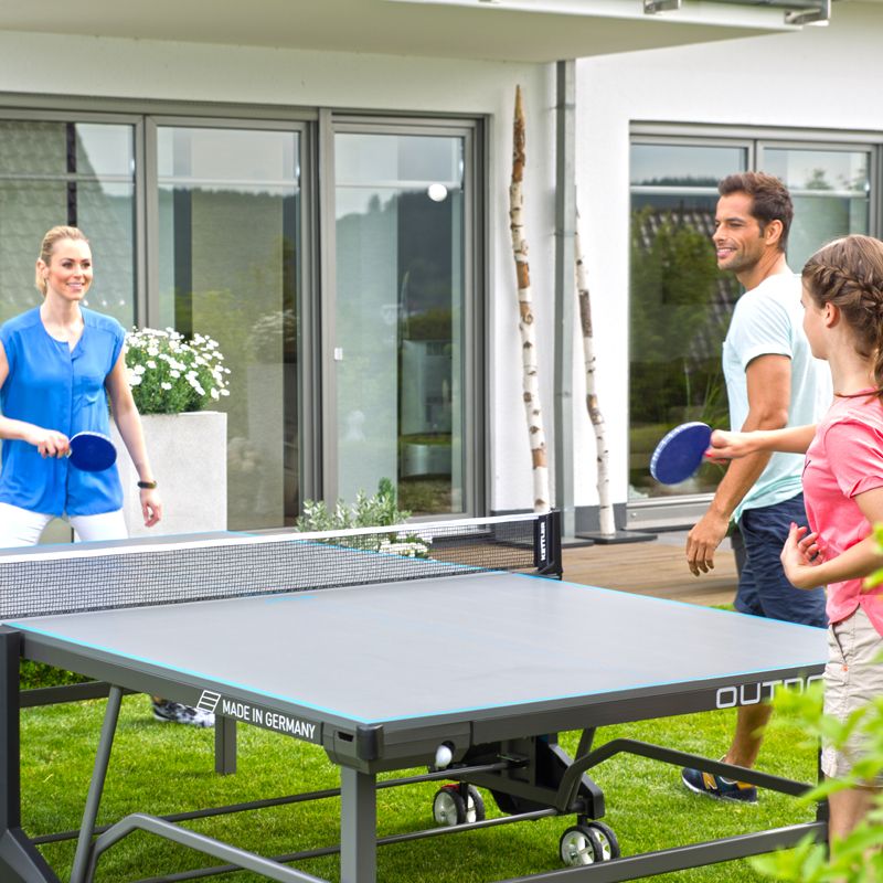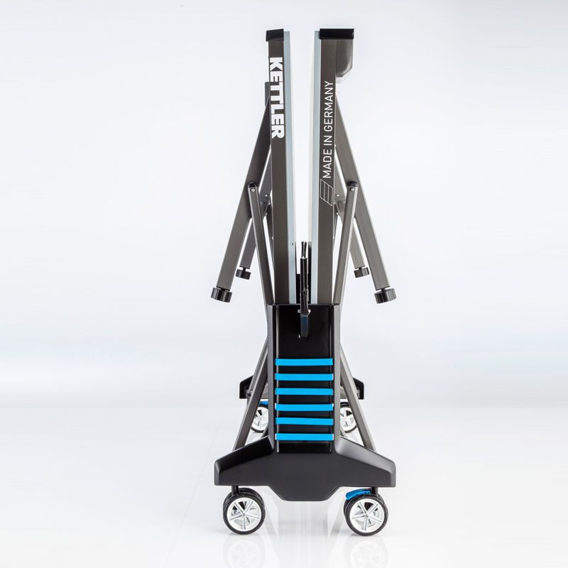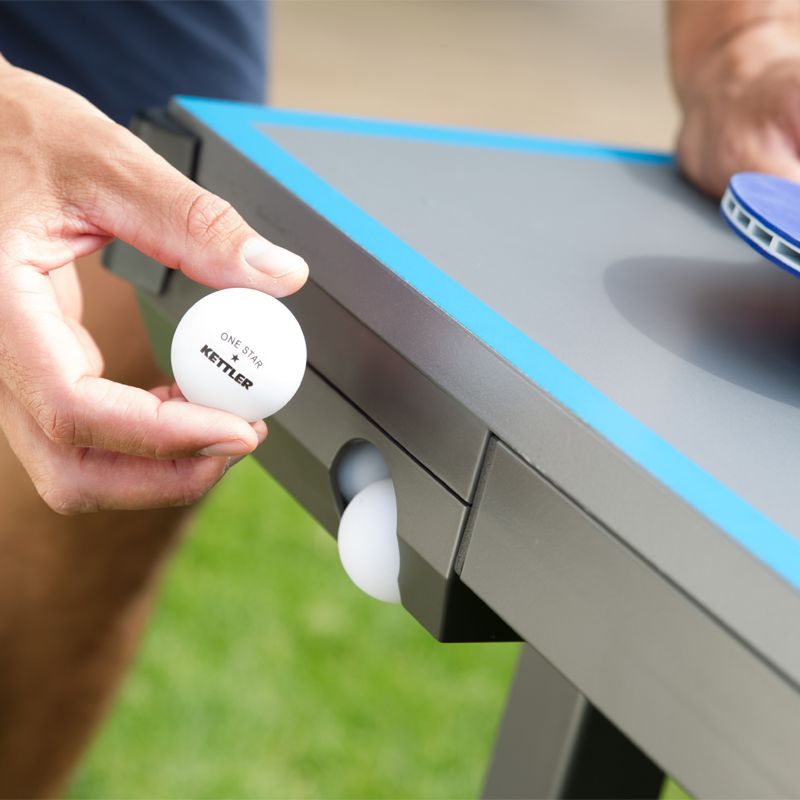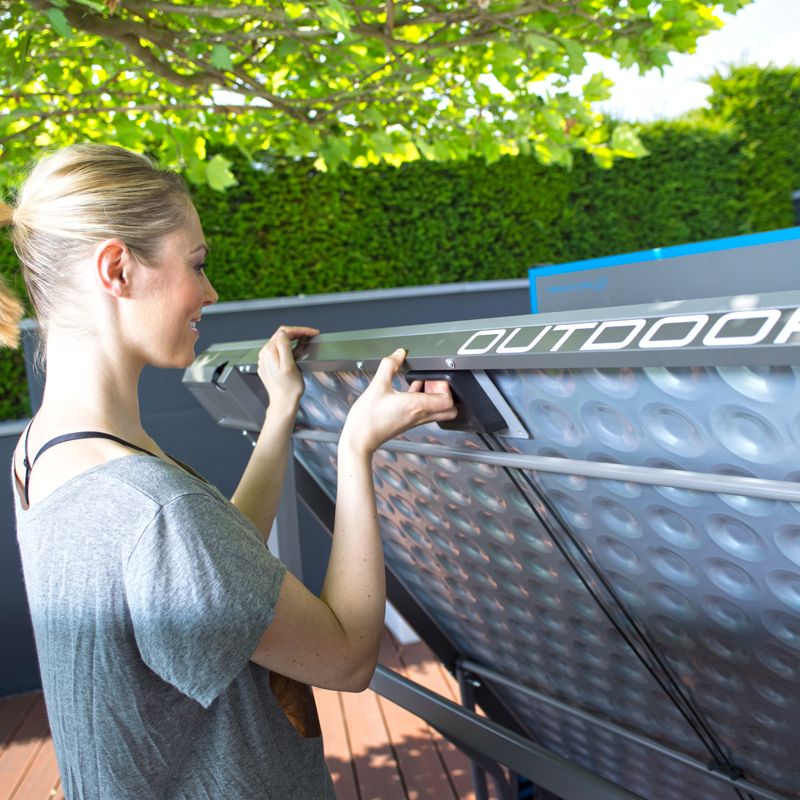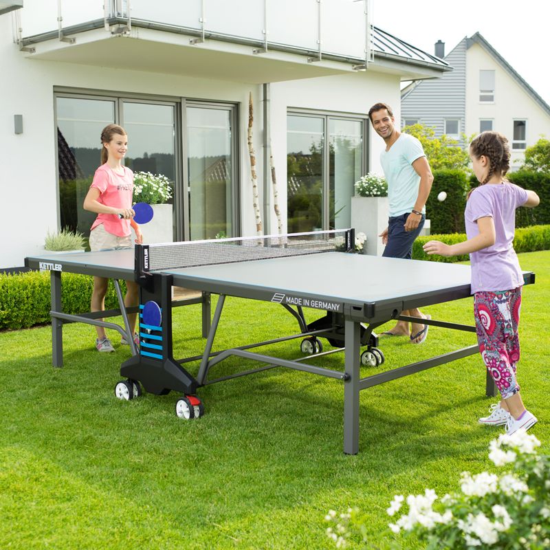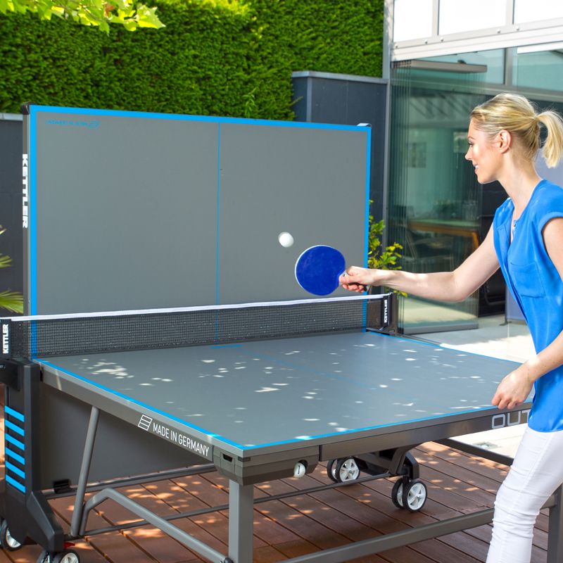 KETTLER OUTDOOR 10, nový pingpongový stůl je vhodný pro rekreační i velmi náročné uživatele všech věkových kategorií. Stůl vyráběný v Německu je vybaven extra silnou hrací deskou ALU-TEC o síle 22 mm, která je díky svým unikátním vlastnostem vysoce odolná vůči vlivům počasí. Díky inovovanému sklápěcímu mechanismu je rozložení i složení pingpongového stolu naprosto bezpečné a nenáročné i pro jednu osobu. Pingpongový stůl je dále vybaven transportními kolečky, kvalitní síťkou, ochrannými kryty na rohy a mechanismem vyrovnávajícím nerovnosti země.