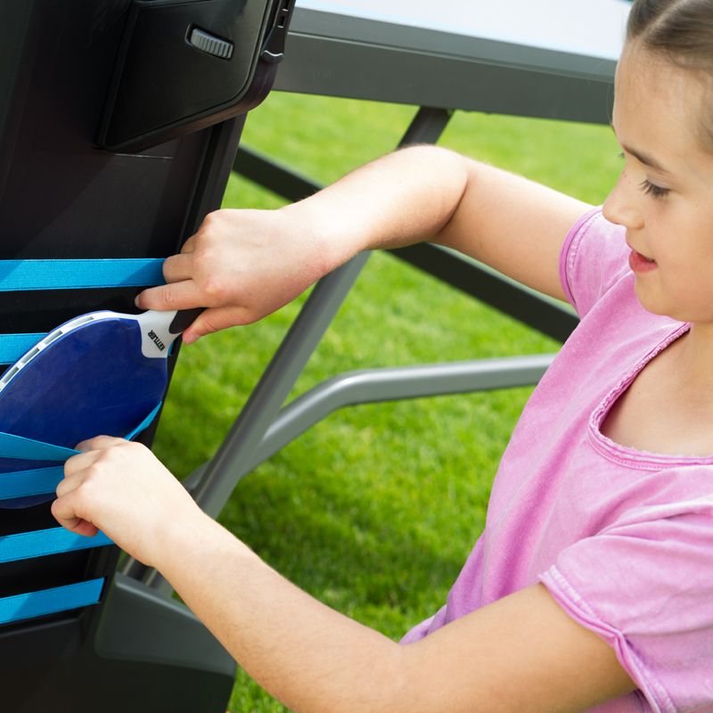 - Dva praktické držáky na tenisové pálky a další příslušenství pro stolní tenis jsou nedílnou součástí pingpongového stolu.