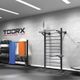 profesionální žebřiny – ribstole s hrazdou, zesílená ocelová konstrukce 75 x 75 mm, 5 příček s šířkou 1050 x ø32, multiúchopová hrazda o šířce 1080 mm,  2 J-háky, možnost rozšíření o další příslušenství, kotvení do zdi, nosnost 120 kg,