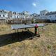 venkovní stůl, sklopitelný, hrací deska z melaminu, 4 otočná kolečka, síťka součástí stolu, možnost hry jednoho hráče, držák na pálky a míčky, hmotnost 45,5 kg, vyroben v Německu