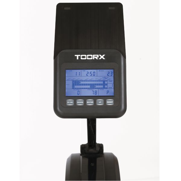 - Displej. Přehledný LCD displej s modrým podsvícením přehledně zobrazuje měřené hodnoty: čas, vzdálenost, frekvenci záběrů za minutu, počet záběrů v rámci jednoho tréninku, spotřebu energie (spálené kalorie), puls, průměrný čas na 500 m a výkon (ve wattech). Udává také číslo zvoleného programu a stupeň zvolené zátěže (1-16). Grafické zobrazení zátěžového profilu (u přednastavených programů) nebo sledování „závodu lodí“ (program Race).