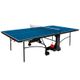 vnitřní stůl, sklopitelný, modrá hrací plocha s antireflexním povrchem, 4 zdvojená transportní kolečka, 2 otočná o 360°, síťka součástí stolu, držák na pálky a míčky, bezpečný mechanismus sklopení stolu, hmotnost 75 kg, modrá – černá