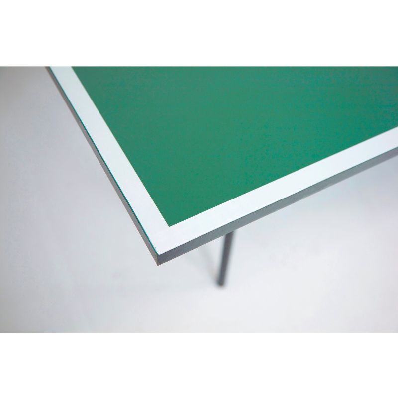 vnitřní stůl, sklopitelný, zelená hrací plocha s antireflexním povrchem, 4 zdvojená transportní kolečka, 2 otočná o 360°, síťka součástí stolu, držák na pálky a míčky, bezpečný mechanismus sklopení stolu, hmotnost 75 kg, zelená – černá