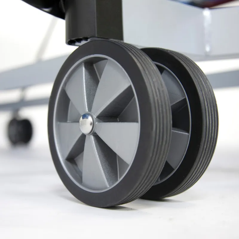 - Čtyři dvojitá kolečka o průměru 125mm, 2 pevná a 2 otočná o 360° pro snadnou manipulaci se stolem v přepravní poloze.